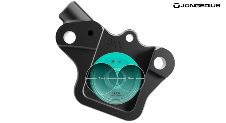 Door de 2 remzuigers met een doorsnee van maar liefst 28mm hebben de remzuigers een 53% groter oppervlakte als remmen van andere merken met een 4 zuiger remsysteem.