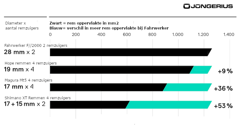 Zelfs een Hope rem met 4 remzuigers heeft ook nog in totaal 9% minder remoppervlakte als de Fahrwerker schijfremmen. In onze tabel kun je dit nog even goed bekijken.