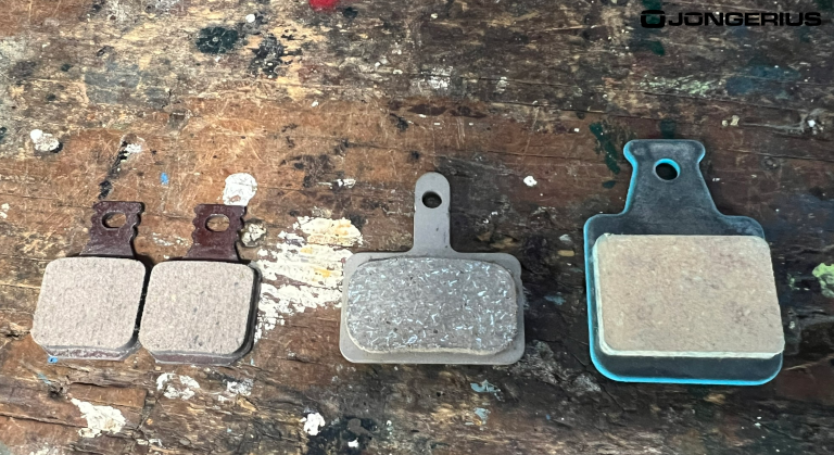 Op de foto is dit goed zichtbaar, links zie je een setje Magura MT5 remblokken voor dubbele remzuigers, in het midden Shimano remblokken voor enkele remzuigers en rechts de Fahrwerker remblokken voor enkele remzuigers.