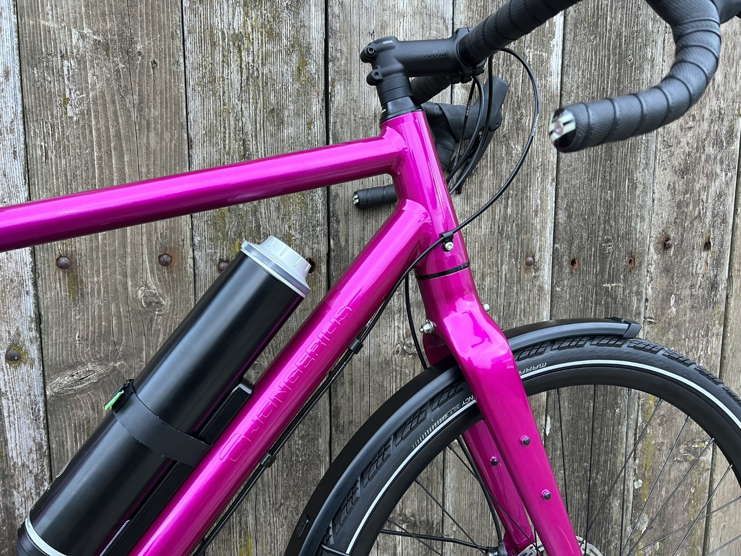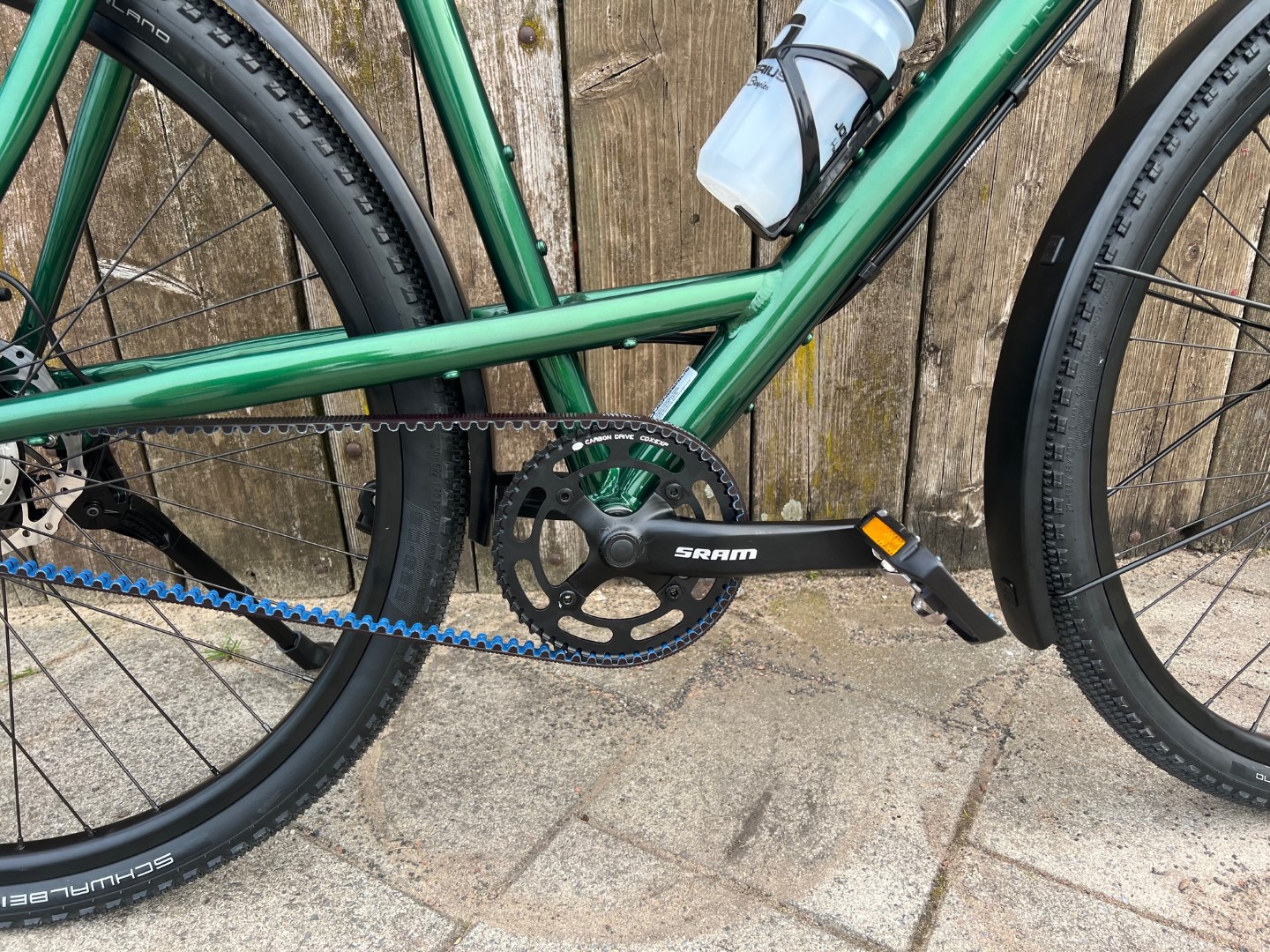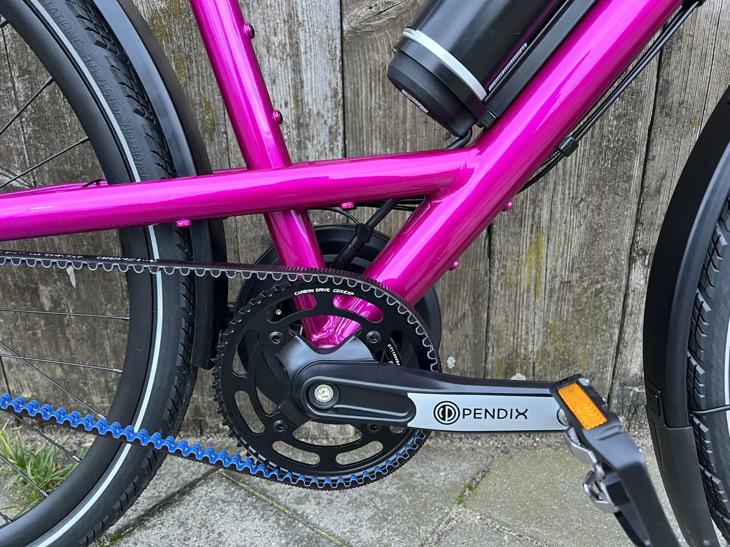 Bij het zien van de fiets valt meteen het unieke frame op, omdat wij dit model volledig als Beltdrive fiets ontwikkeld hebben is er gekozen om het kwetsbare uitneembare blokje voor de montage van de beltdrive weg te laten en de achtervork te verhogen. Door de hogere liggende achtervork loopt de Beltdrive nu onder de achtervork door wat de stabiliteit van het frame sterk ten gunste komt.